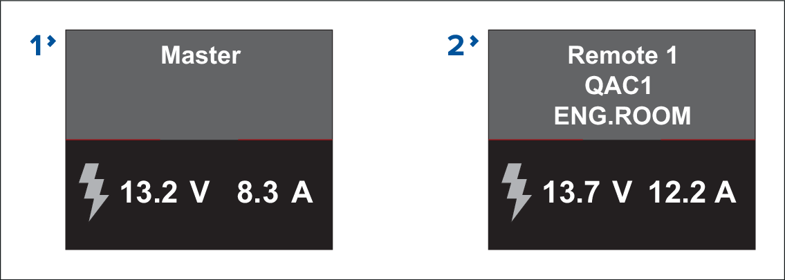 The default page displays the Master system’s / Remote system’s voltage and current. The Remote module’s default page will also display the ID of the Remote module.