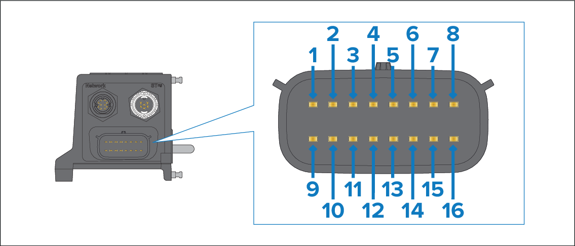 The 16 pin connector on the Master module allows connection to 2 x J1939 and 2 x RS-485 devices. The module’s connector pin out is shown below: