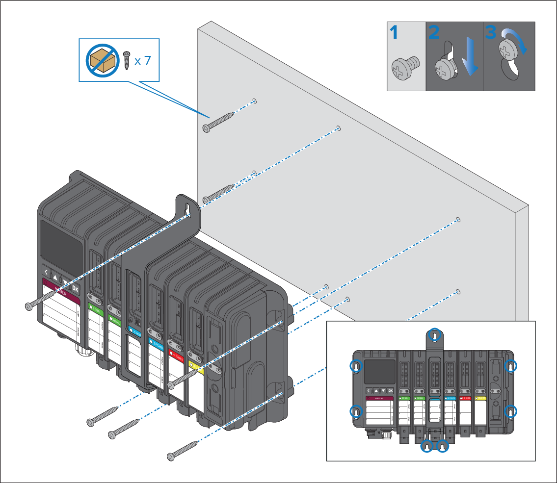 Use 7 x fixings, not supplied, appropriate for the intended mounting surface. The fixings should be appropriate width for the 5 mm (0.2 in) module mounting holes.