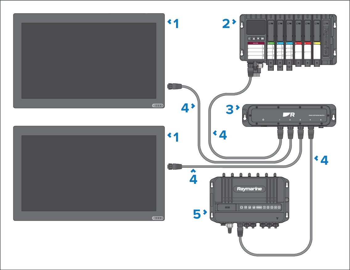 The example below uses a network switch, however the Master module can also be connected directly to a chartplotter’s (MFD’s) RayNet network connection.