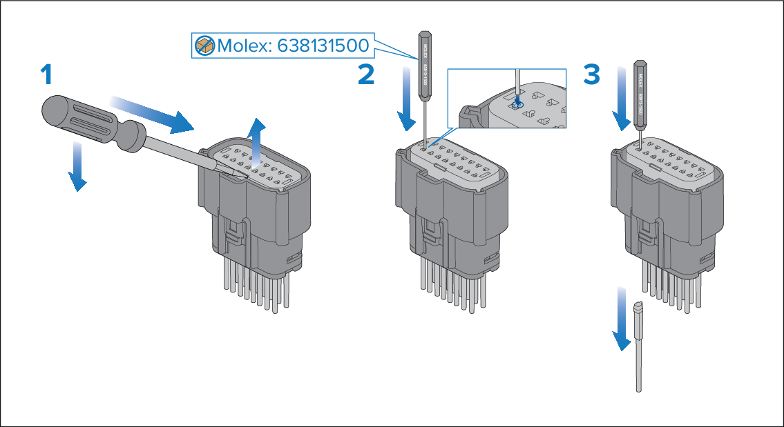 - Insert the 1.50 mm (0.59 in) diameter Molex® tool (part number: 638131500) into the terminal service hole adjacent to the relevant terminal.