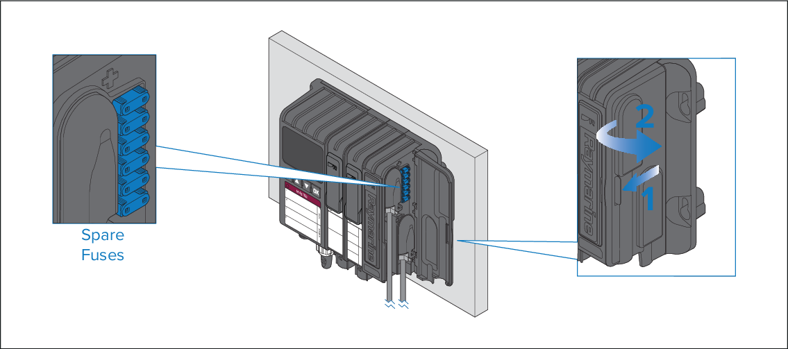 The Power supply module is supplied with spare fuses that are located in the power connection compartment.