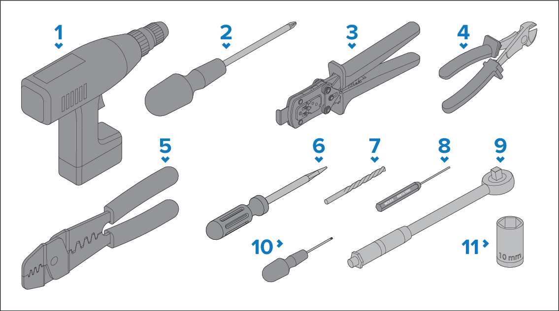 The following tools are required to install and connect a YachtSense DCS-Series Digital Control System to a vessel’s electrical system.