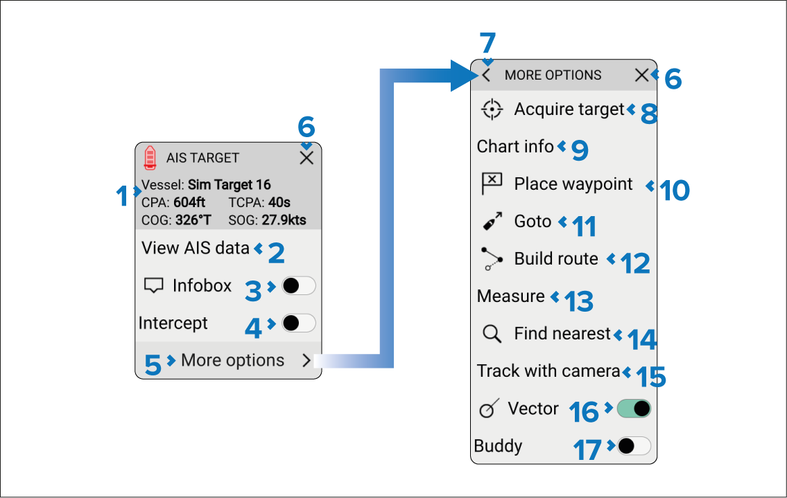 When an AIS target is selected in the Chart app, the AIS target context menu is displayed.