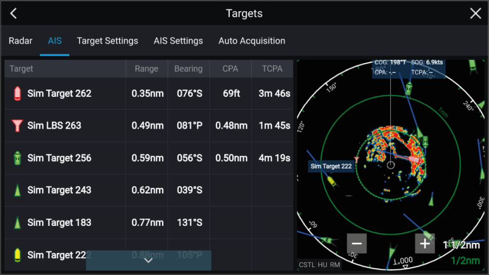 The list identifies: Target name and Range and Bearing (from your vessel). Where relevant, CPA (Closest point of approach) and TCPA (Time to Closest Point of Approach) values are also shown.