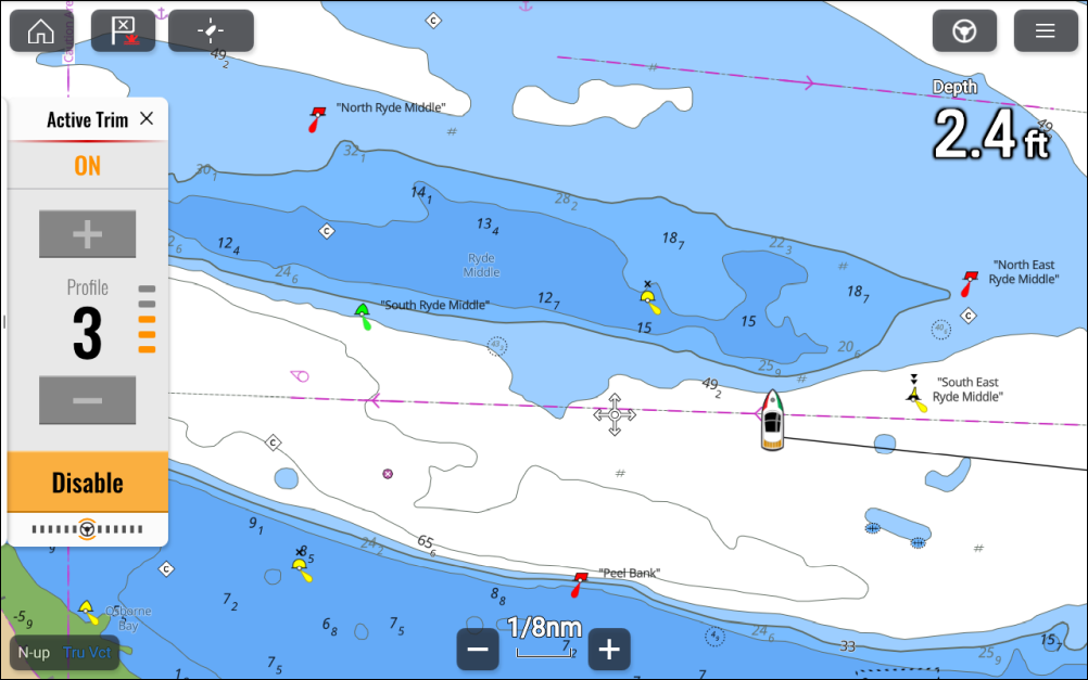 If your Mercury system supports it, Active Trim can be set up and controlled from the display. Active Trim is Mercury Marine’s patented GPS‑based automatic trim system. This intuitive, hands‑free system continually adjusts engine or drive trim for changes in operating conditions to improve performance, fuel economy, and ease of operation.