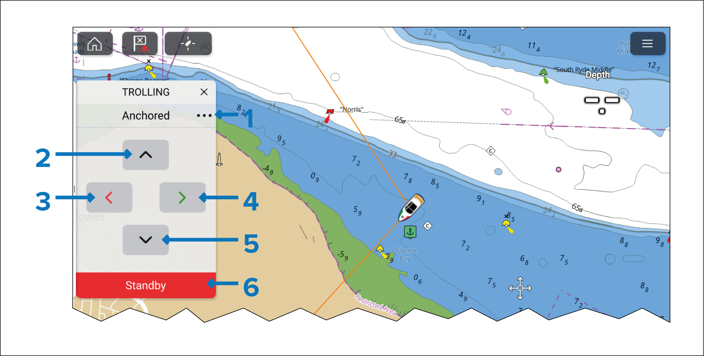 Selecting the directional controls Up, Down, Left, Right will move (‘jog’) the anchor location in 5 foot increments, relative to the boat’s heading. E.g.: Selecting the Right button once will move the anchor location 5 feet to the right of the boat’s bow.