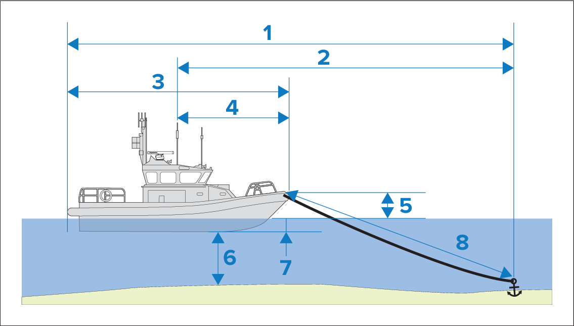 Maximum swing radius — this calculation is determined using Boat length, Bow to GPS distance, Chain length and Depth.