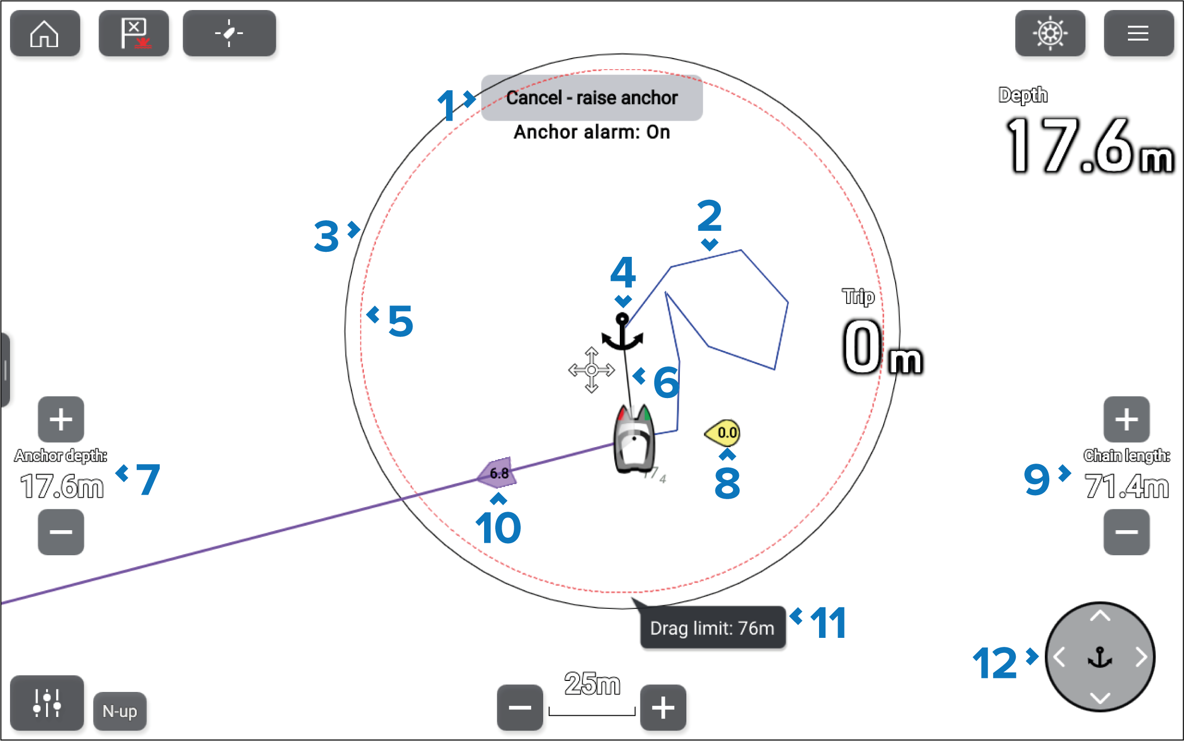 Cancel — raise anchor button — Cancels the anchor alarm. The status of the alarm is shown below the button.
