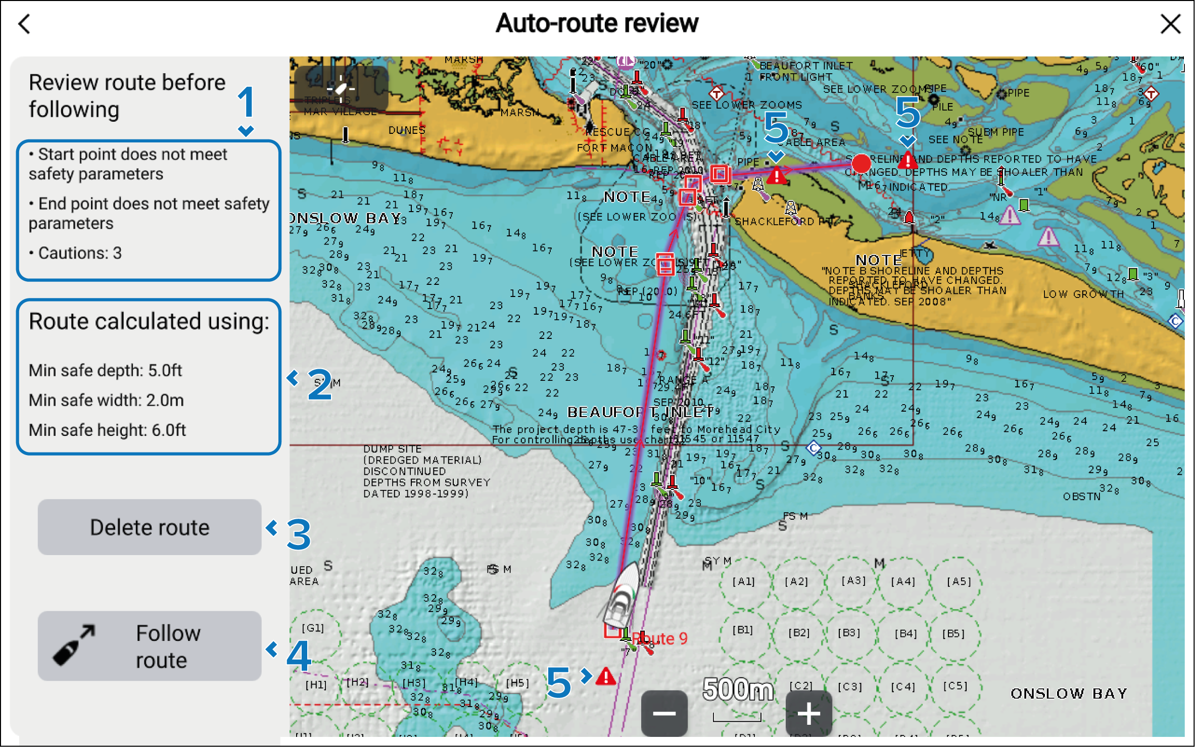 The Auto-route review menu provides the necessary details to check a route is safe and identify the areas that require caution.