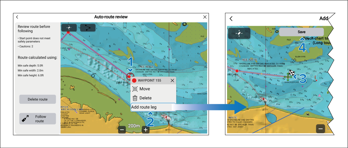 When route legs are added, you must ensure that they are placed in a safe, navigable location, as the system does not apply the safety distances criteria to additional route legs.