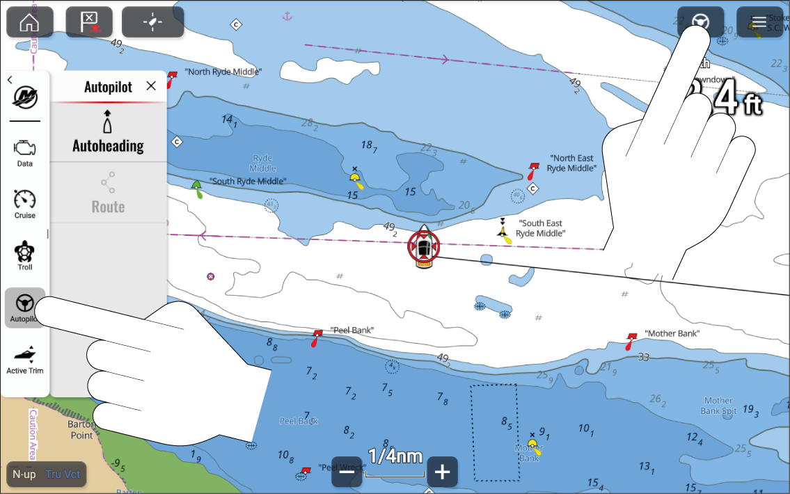 Autopilot controls can be accessed from the Autopilot sidebar. Performing a Goto or Follow route in the Chart app will also provide options to engage your autopilot.