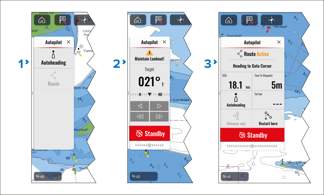 With the autopilot in standby, the Autopilot sidebar has Autoheading or Route options. You can select Autoheading to engage the autopilot and maintain the current heading.. If you are already following a route, you can select Route to engage the autopilot in Route mode. In Route mode, the boat will follow the route and when a waypoint is reached the boat will automatically proceed to the next waypoint in the route.