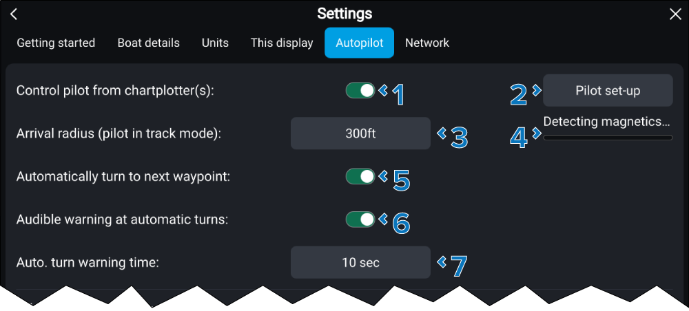 Pilot set-up Select to access autopilot settings. For more information refer to: Autopilot settings — Pilot set-up menu |