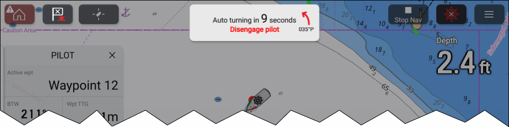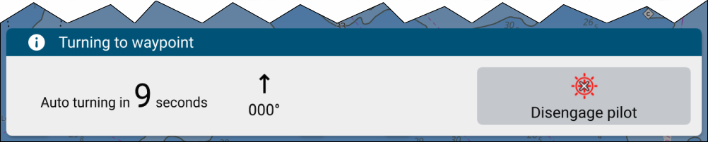 Select Disengage pilot from the turning to waypoint notification to disengage the autopilot and prevent the vessel from automatically turning.