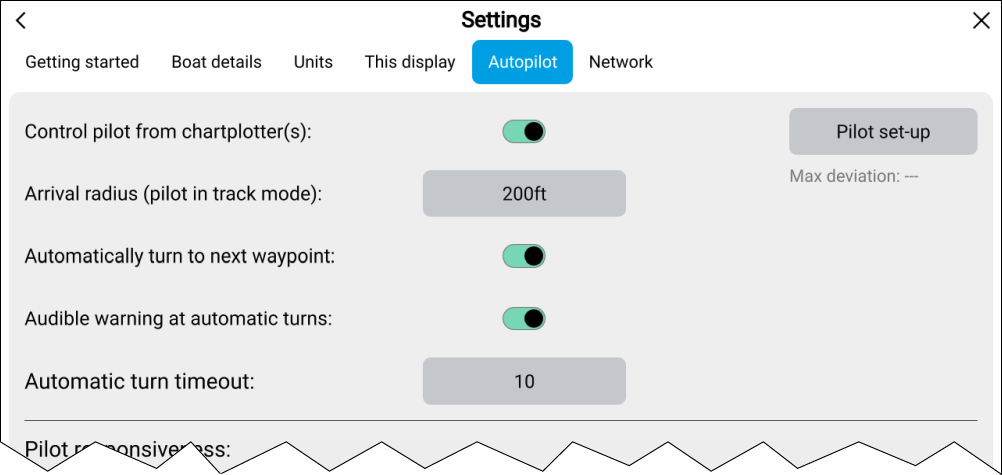 Automatic turning is disabled by default. Automatic turning can be enabled and configured from the Autopilot settings menu: .