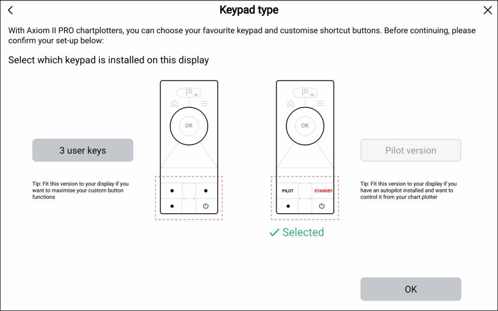 By default Axiom® 2 Pro displays are fitted with the Pilot Version lower keypad. If you intend to keep the Pilot Version lower keypad, select the Pilot version button and then select OK.