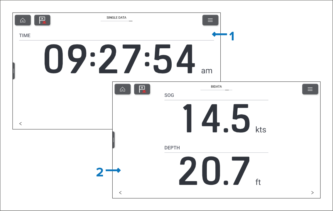 Bidata page — By default the bidata page displays SOG (Speed Over Ground) and depth.