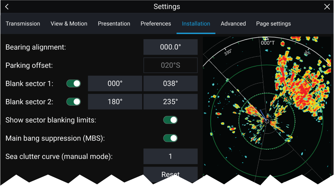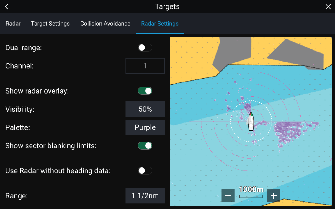 Two blank sectors can be enabled. You can edit the minimum and maximum limits of each blank sector; this will determine how much of the radar display is hidden.