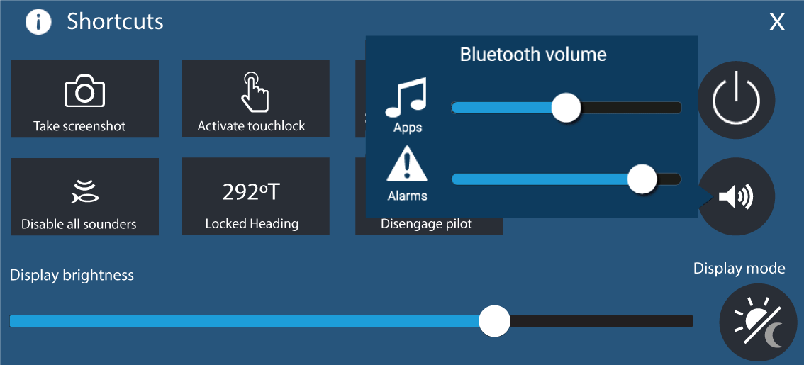 Press or swipe the Power button to display the Shortcuts page and then select the speaker symbol to display the Bluetooth volume control for LightHouse™ apps and MFD alarms.