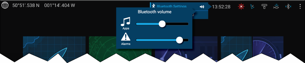 From the Homescreen select the Status area and then select the Speaker symbol to display the Bluetooth volume control for LightHouse™ app and MFD alarms.