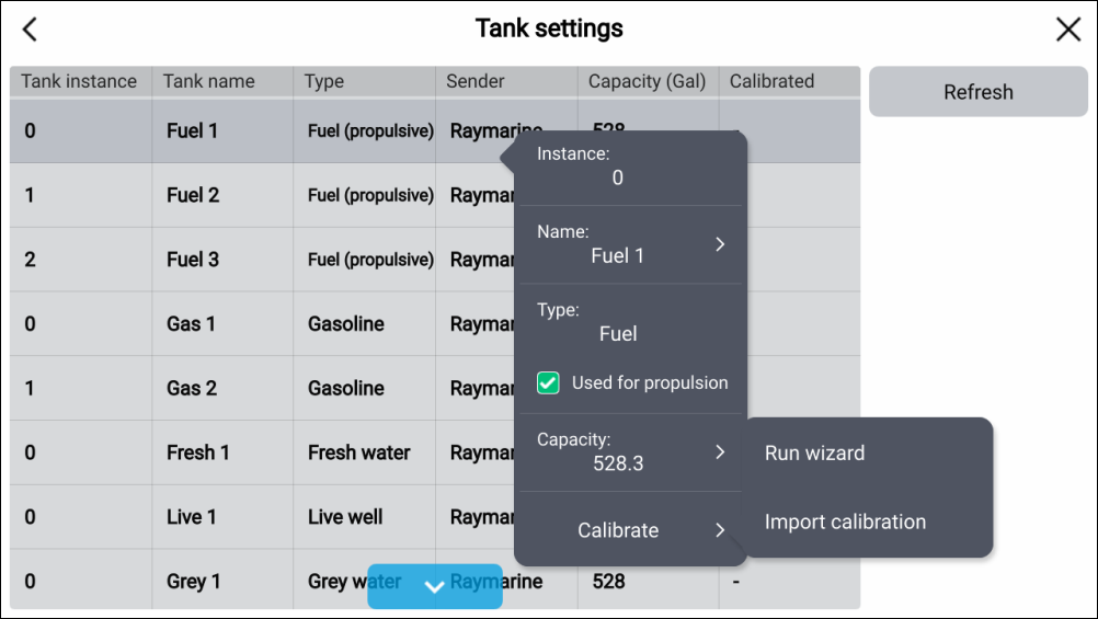 Tanks can be calibrated and edited on the Boat details settings menu: .
