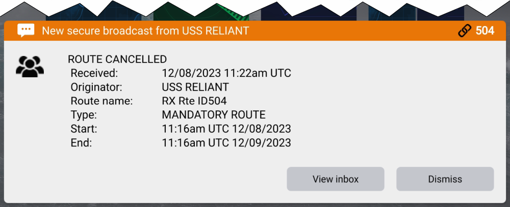 A route cancellation message will be received by the recipient vessel(s), and the route’s status will be set to Cancelled.
