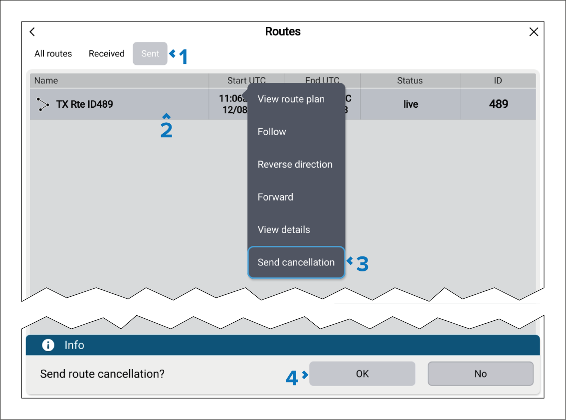 RoutesCancelling sent routesFirst responder Cancelling sent routesThe sent route can be cancelled from the Routes list. The routes list can be accessed from: