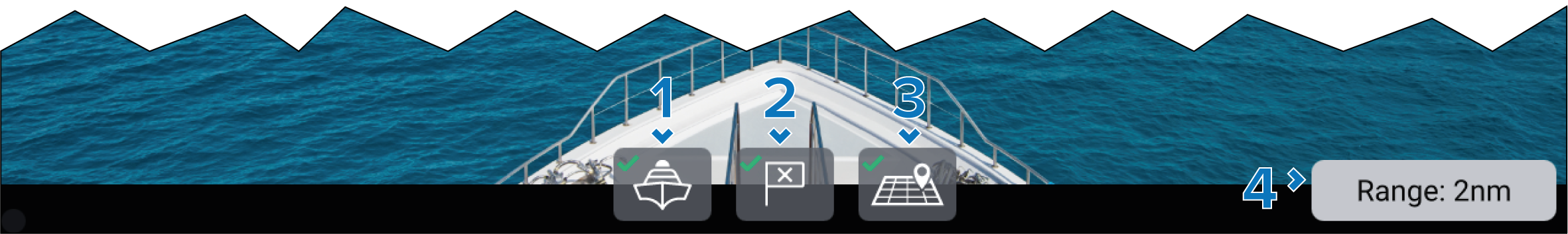 All flags uses icons and shows your vessel’s range from the target’s location.