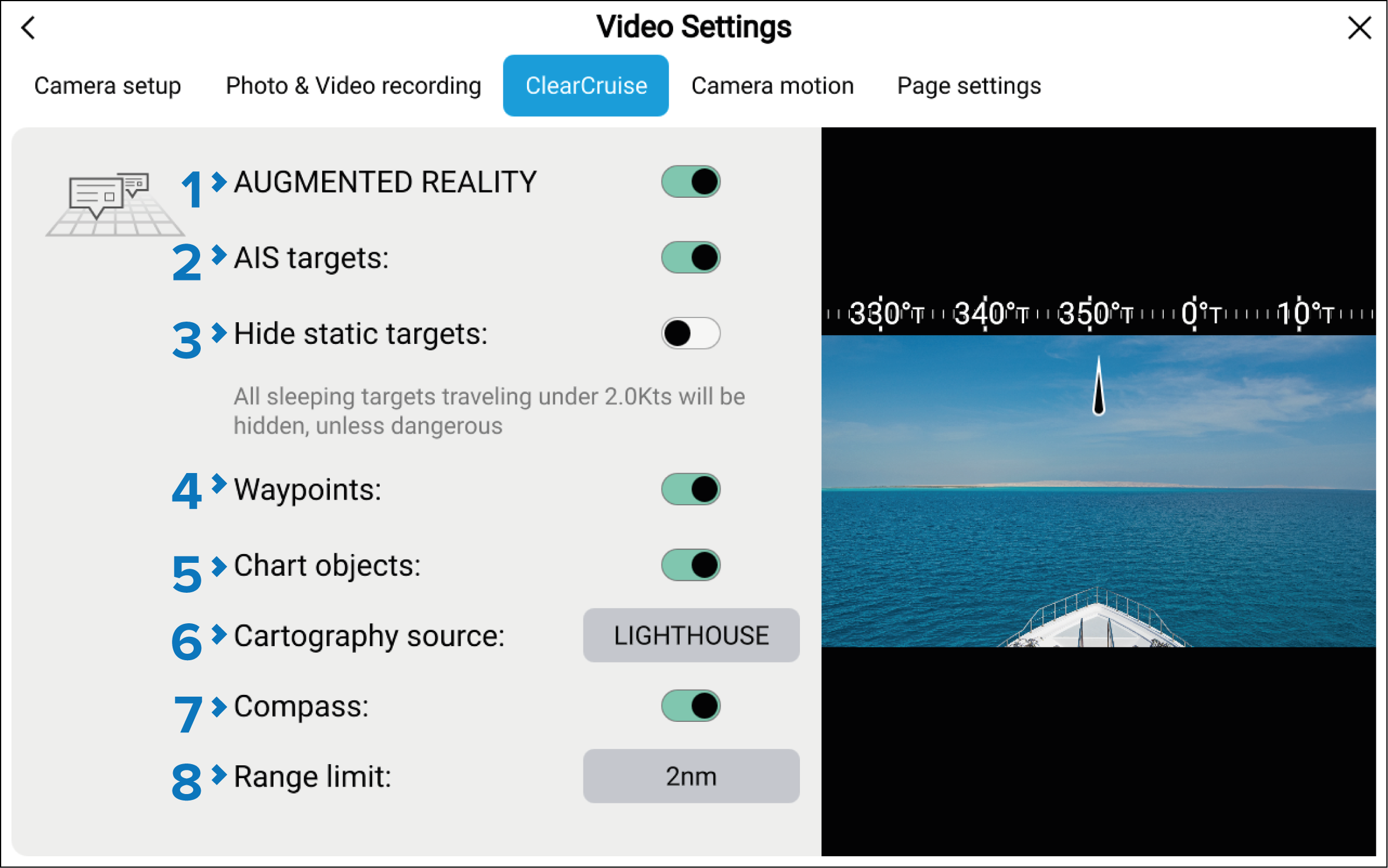 AIS targetsAugmented RealityAIS targets Enables/disables the display of other vessels as Augmented Reality flags (requires AIS). |