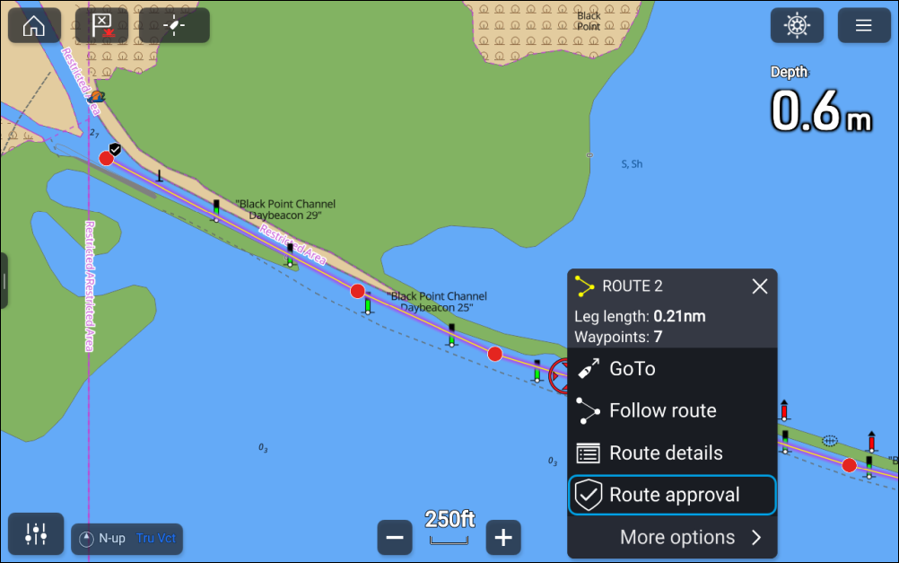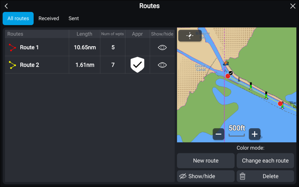 Command approved routes will include an approved symbol next to the first waypoint in the route and in the Appr field in the Route list.