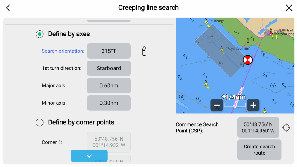 - Selecting the Commence Search Point (CSP) coordinates field to enter new coordinates, or.