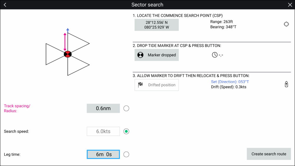 Set the Track spacing/Radius, Search speed and Leg time: