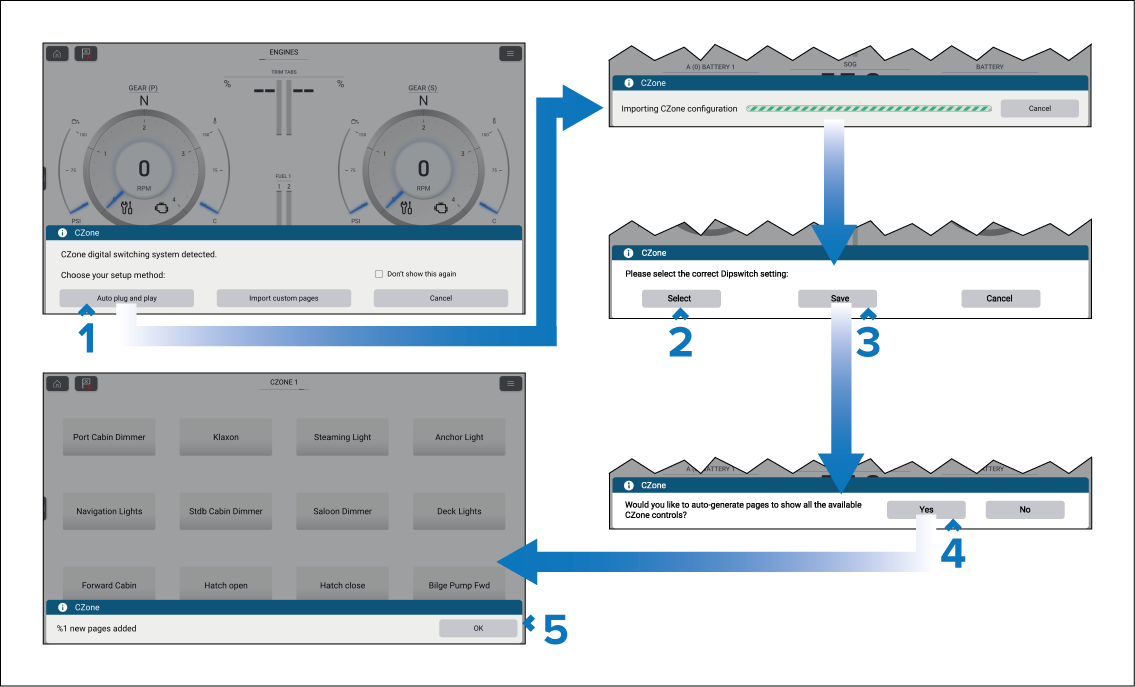 When the Dashboard app detects CZone hardware and the system does not have an existing digital switching configuration installed, the CZone plug and play wizard is started.