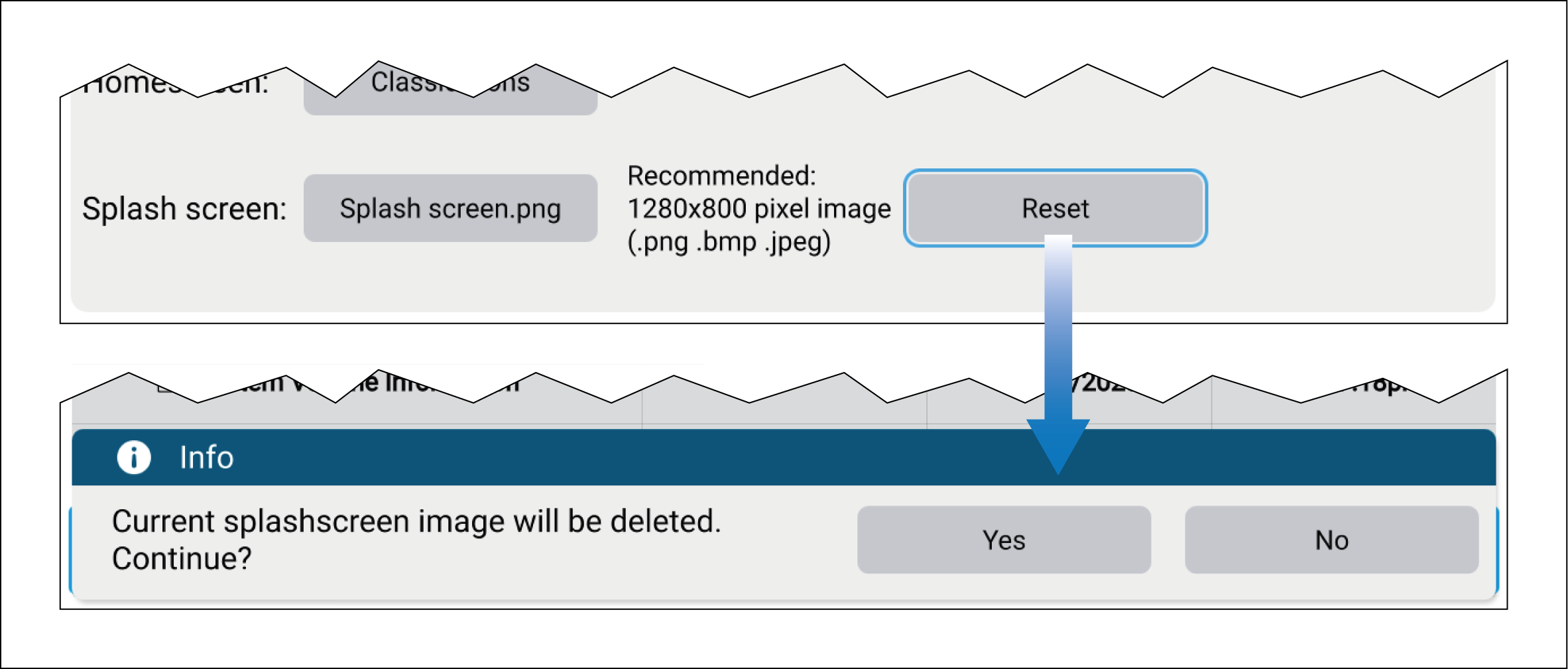 The splash screen image can be reset at any time by selecting the Reset button and then selecting Yes on the notification dialog.