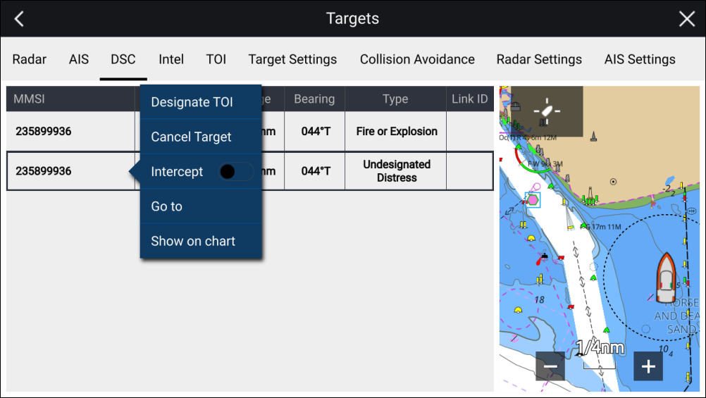 DSCTarget listThe DSC target list can be accessed from the Targets menu in the Radar app and Chart app: