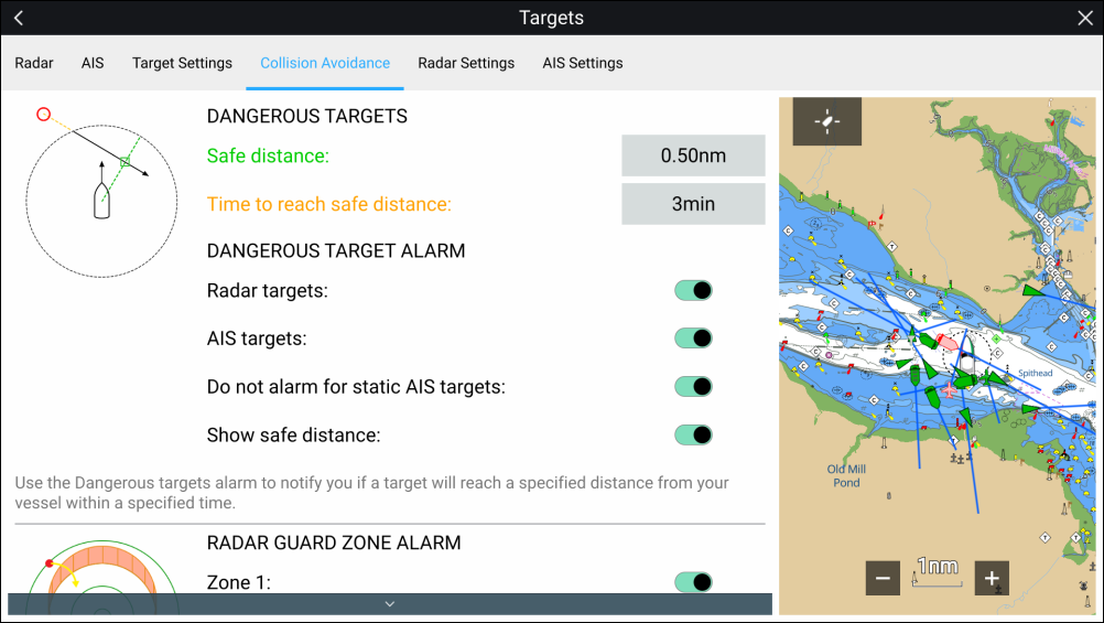 Dangerous targets alarmRadar targetsRadar targets — Enables Radar targets to be included in the dangerous targets alarm. If this setting is disabled Radar targets will not trigger the dangerous targets alarm.