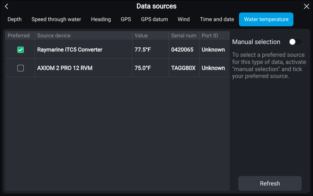 Data sources SelectionEach menu tab enables you to view the available data sources and, if required, manually select your preferred data source. The currently active data source will be ticked and display its current value in use.