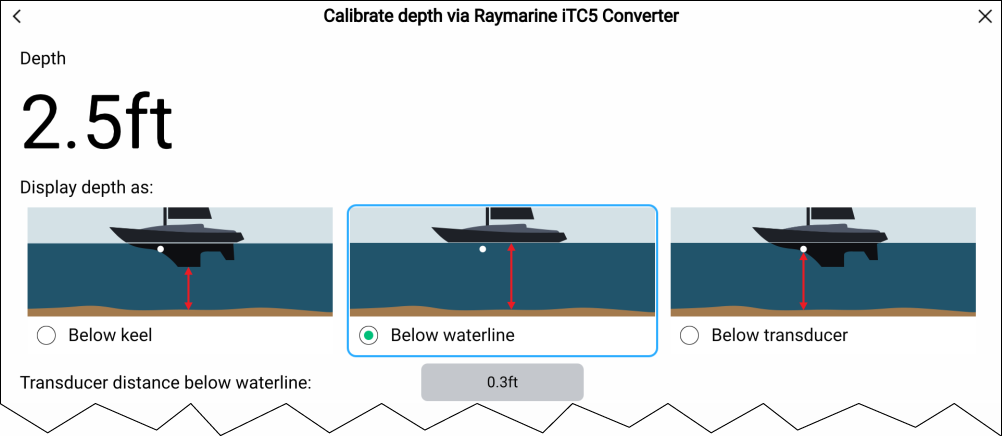 Below waterline — The depth reading will be increased from the transducer’s default reading by the offset value you specify. The offset should be the distance between the waterline and the transducer.