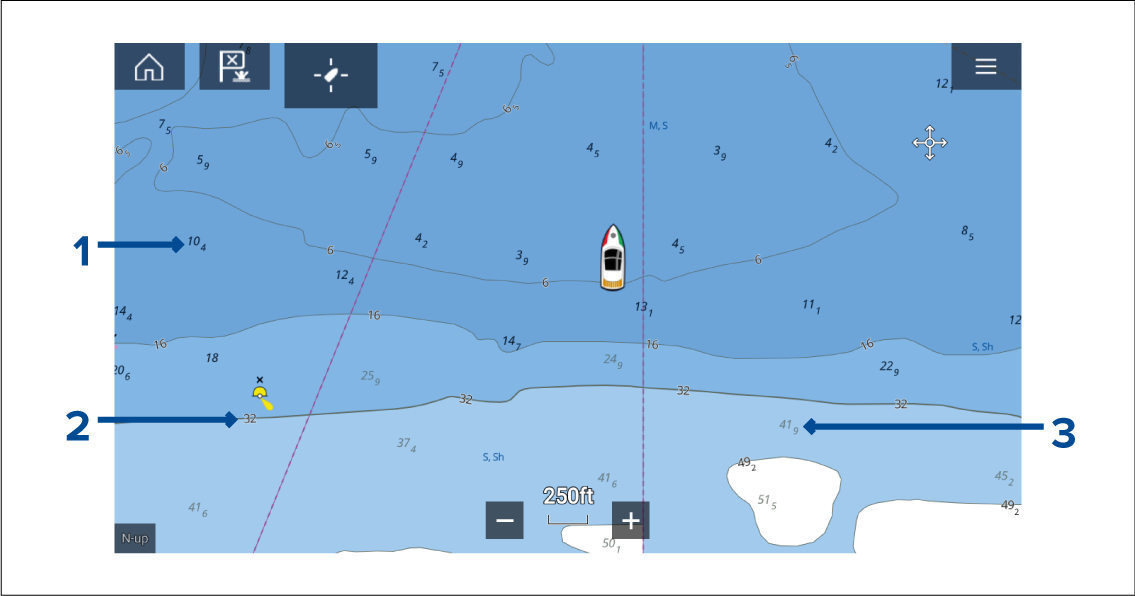 Bold depth soundings — Depth soundings displayed in Bold reflect depths shallower than the specified Safety contour depth.