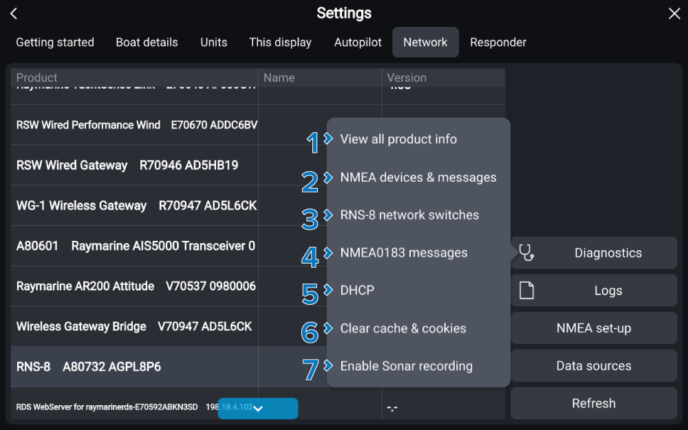 DiagnosticsRNS–8RNS-8 network switches View diagnostics information for connected RNS-8 network switches. For more information refer to: RNS-8 Diagnostic information |
