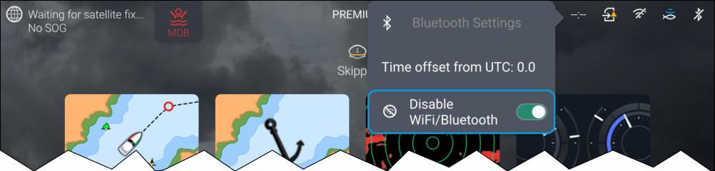 BluetoothDisableWi-FiDisableThe Disable WiFi/Bluetooth is available from the Homescreen Status area’s pop-over menu. Enabling the toggle switch will disable the chartplotter’s Bluetooth and Wi-Fi connections.