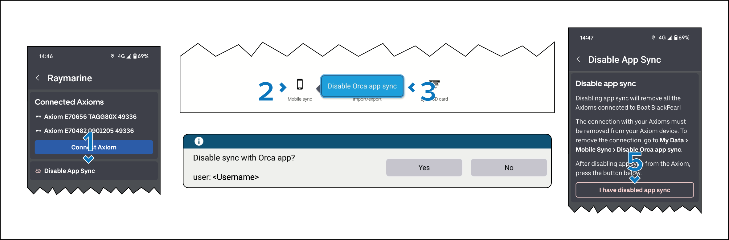 - From the Orca app: select Disable App Sync from the Raymarine Integrations menu: .