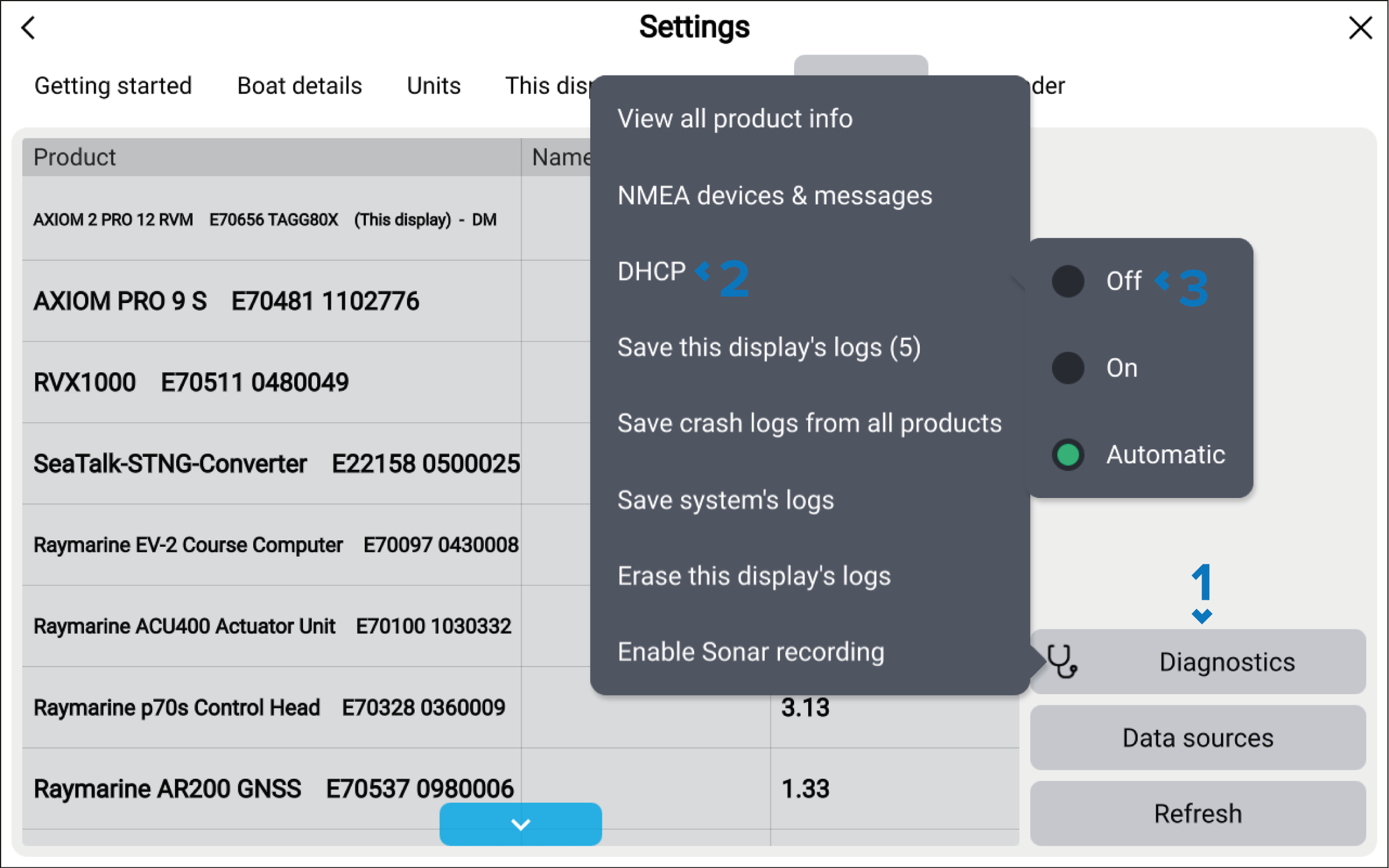 By default the MFD/chartplotter will act as the DHCP server for devices connected to the Ethernet (RayNet) network. If required the DHCP server can be switched off.
