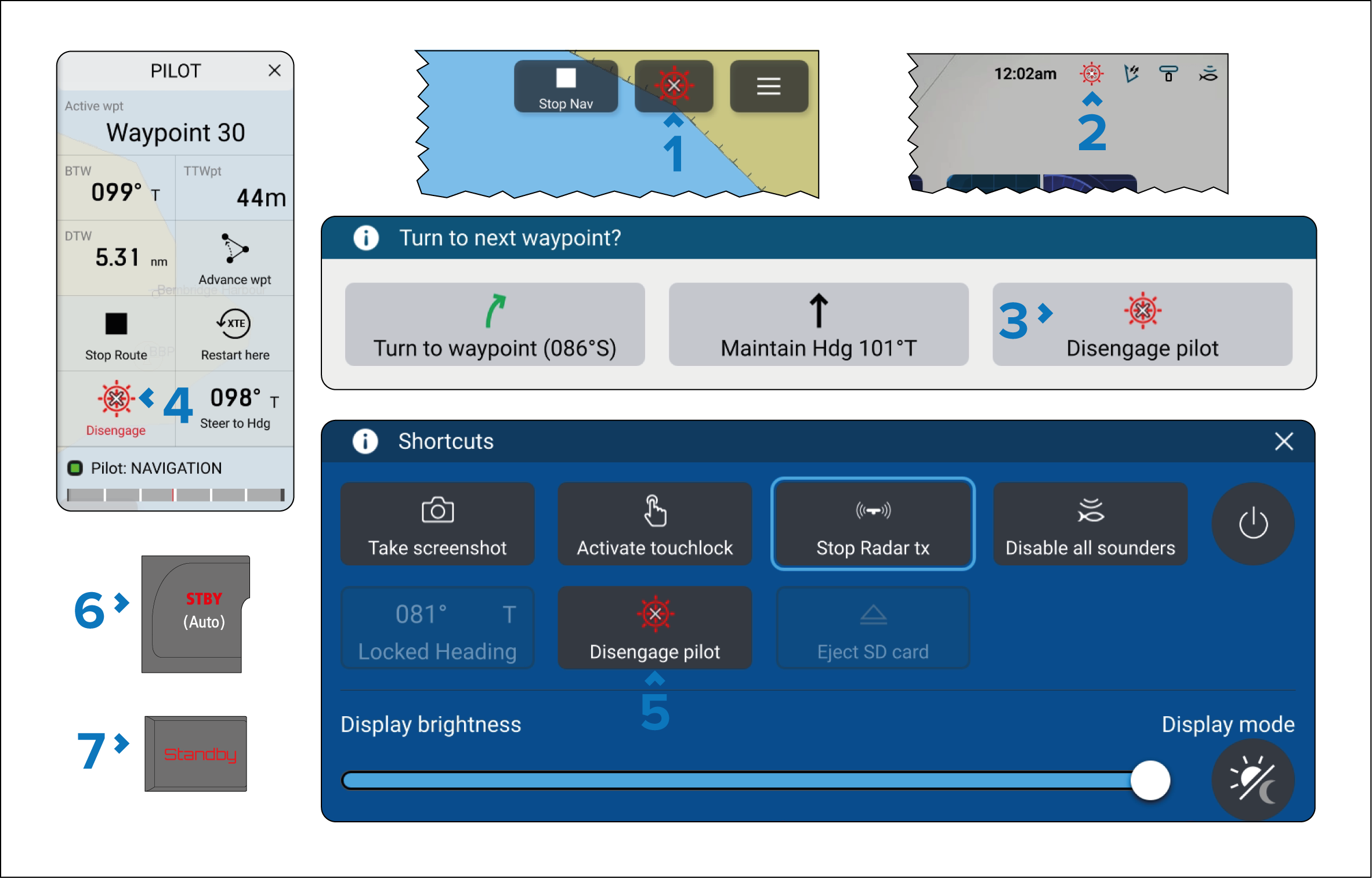 The autopilot can be disengaged using the Disengage pilot icon or a physical standby button.