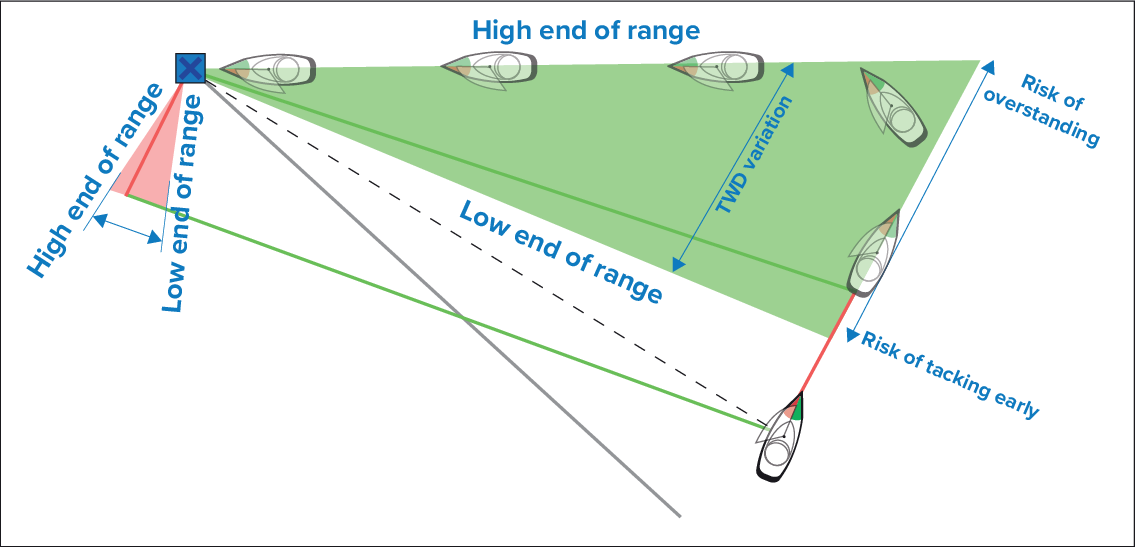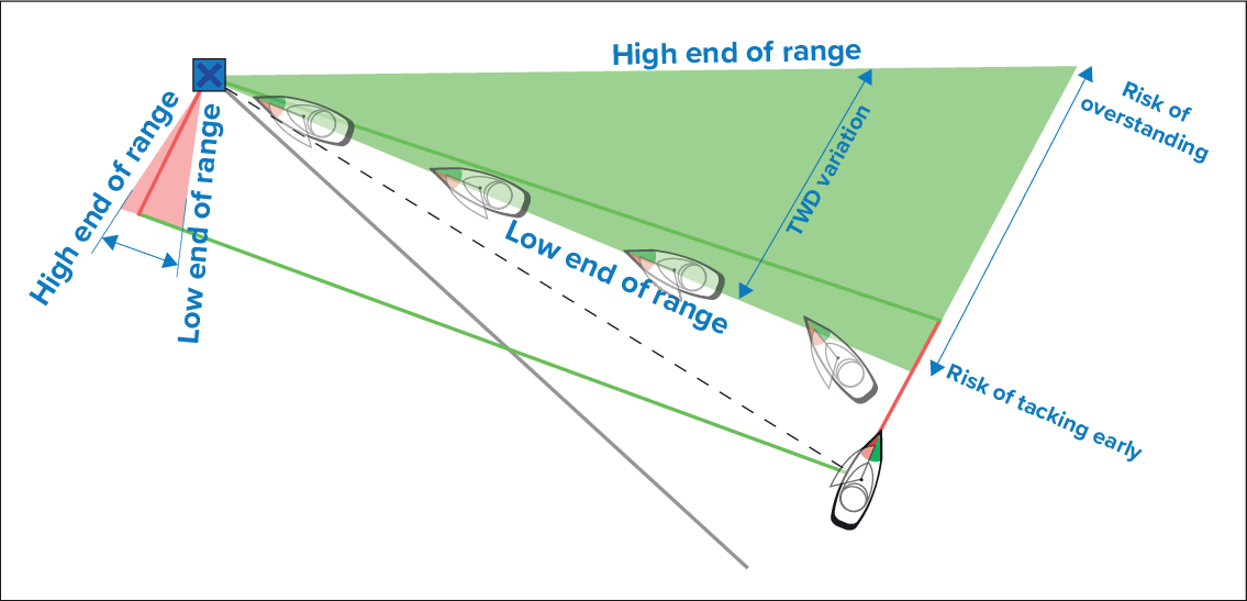 With TWD holding at the high end of its range of variation, the vessel can tack to starboard and will only lay the windward or leeward mark as it reaches the end of the shaded area. However, if TWD shifts back towards the lower end of its range of variation, the vessel will fall short of the layline and may have to perform extra tacks to reach the waypoint.