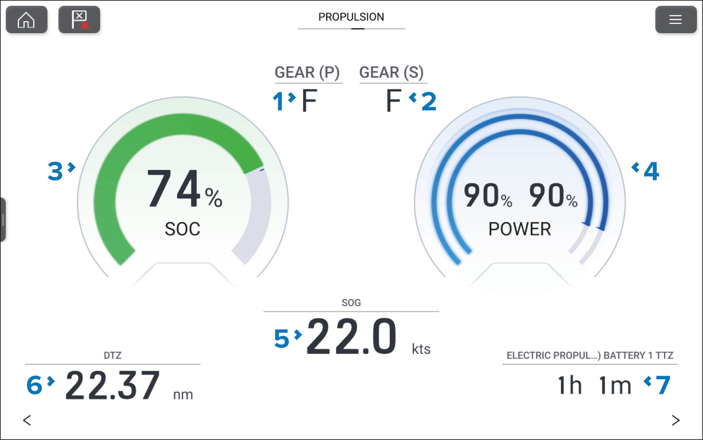 The electric Propulsion page is available when the Propulsion system has been set to Electric. The number of motors (1 or 2) displayed on the page is based on the number of motors selected during the display’s initial start up wizard. The Propulsion page includes data relevant to electric propulsion system and includes the graphical dials.