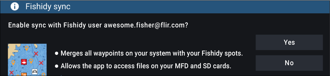 Attempting to sync a new Fishidy account to your MFD while it is already synced with another account will prompt you to end sync with the first account. Ending sync with the first account and syncing the second account replaces any existing Fishidy Spots and Waypoints.
