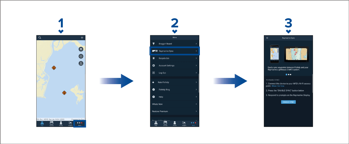 After connecting your mobile device to your MFD’s Wi-Fi, you can begin syncing waypoints and Fishidy spots with the Fishidy app.
