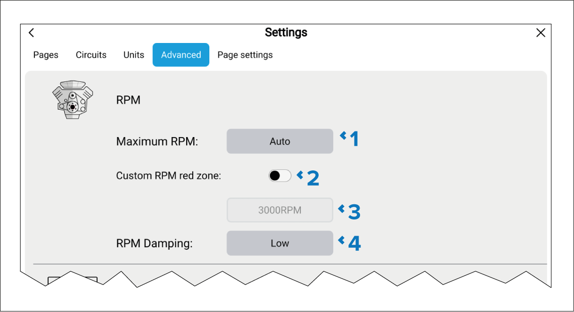 The advanced settings menu allows you to specify some advanced settings for engine RPM dials and data.